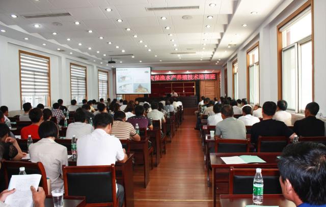 服务团根据灾后现场观察和了解的实际情况,进行总结归纳,利用晚上休息时间有针对性地准备培训内容。陆宏达为金坛市渔业部门科技人员和养殖户作了水产动物疾病和灾后疫病防控的相关培训,受训人员近150人。吴旭干和李嘉尧分别作了灾后河蟹养殖管理技术和灾后青虾养殖管理技术的相关培训。