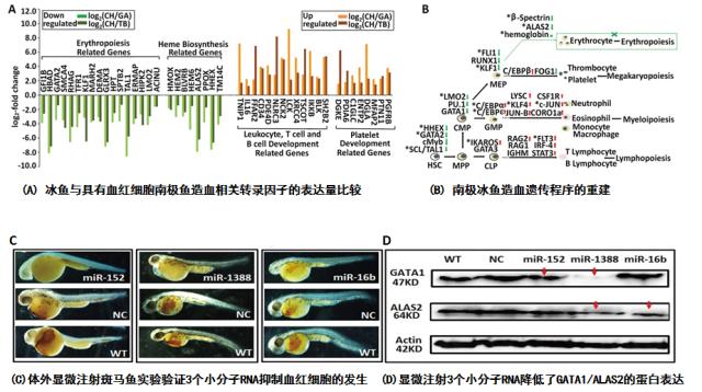 公司科研人员利用跨物种的转录组与小分子RNA组比较,揭示出南极冰鱼在造血程序上发生了大规模的基因调控的重建。它们在负责造血的组织(如头肾)中,一方面强力抑制了与造血相关的因子如GATA1,ALAS2等的表达,同时调高了上百个microRNA的表达。实验表明这些上调的microRNA很大部分与抑制造血转录因子有关。更有意思的是,课题组研究人员首次发现:造血转录因子的强力抑制以及microRNA表达的普遍调高都是由一个相同的信号通路,即TGF-β信号通路的上调所引起的。进化分析表明,TGF-β信号通路中的两个重要因子,TGF-β1和endoglin在南极鱼亚目鱼类的进化中发生了正选择,而这种正选择作用发生在南极鱼亚目鱼类进入南极后形成的所有科属的鱼类中,而不仅仅局限于血红蛋白丢失的冰鱼科鱼类中。这表明,南极鱼类在进入低温的南极海域后就发生了调高TGF-β信号通路的进化趋势。这种趋势导致生活在南极的鱼类有血红细胞减少的普遍趋势,而这种趋势在冰鱼科鱼类中表现更为强烈。因此,冰鱼血红细胞的丢失具有对低温环境适应的进化意义。本项工作在分子水平深化了人们对鱼类血液细胞发生与低温适应之间关系的认识。