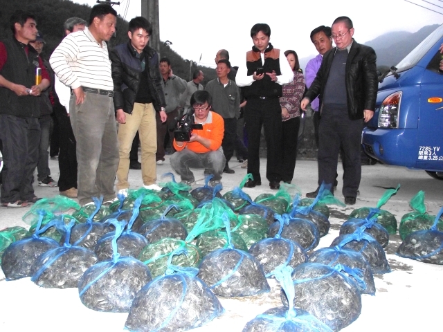 苗栗县丘陵地带狮潭乡合兴村养殖户吴育德是苗栗县最早开展大闸蟹养殖的农户,2006年始即与上海市崇明县水产技术推广站接触并引进大闸蟹种苗在苗栗县开展养殖。仿照大陆池塘养殖大闸蟹的“草蟹模式”,经过几年的摸爬滚打,吴育德先后在狮潭乡、公馆乡建立了适合苗栗县气候、地形地貌、水文等特点的大闸蟹的养殖场,但养殖成活率低的问题一直困扰着他。专家组详细询问了有关大闸蟹种质种源、水源水质、水温、土壤、水草种类、饲料来源、日常管理等基本情况,现场取样、摄影并记录了有关池塘建设、水草种植、水质管理、种苗投放数量等技术措施。在县政府牵头下召开了大陆—苗栗县大闸蟹养殖技术研讨会,专家组与近50位养殖户就技术问题进行了交流,详细了解了存在的问题和瓶颈。吴嘉敏指出:苗栗地区要解决大闸蟹养殖的瓶颈问题首先应从种质种源着手,优质的种苗是保证成活率高的前提,技术环节的优化和细化是基本保证。大陆专家和苗栗县农会要通力合作,创建适合苗栗地区气候、水文、水温、地质地貌、土地经营模式、消费习惯等特点的科学养殖模式是促进苗栗县大闸蟹养殖深度发展的头等大事。
