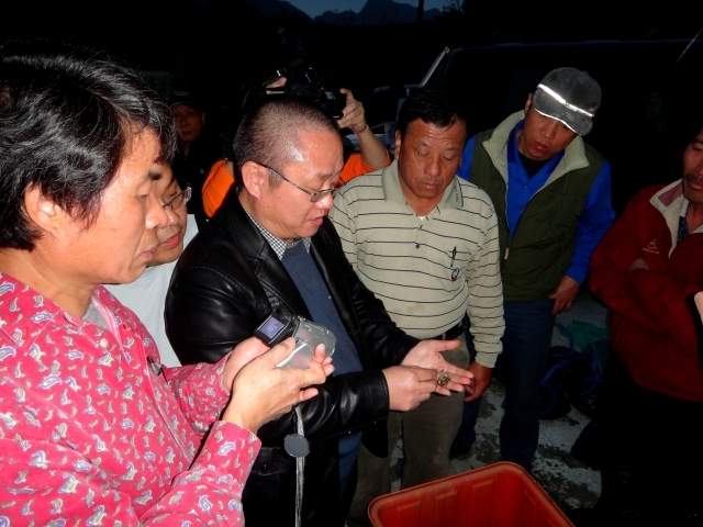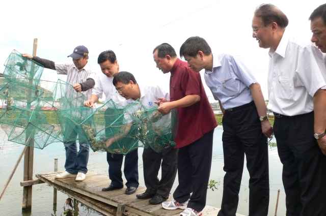 时任上海市副市长姜平查看苗栗河蟹生长情况