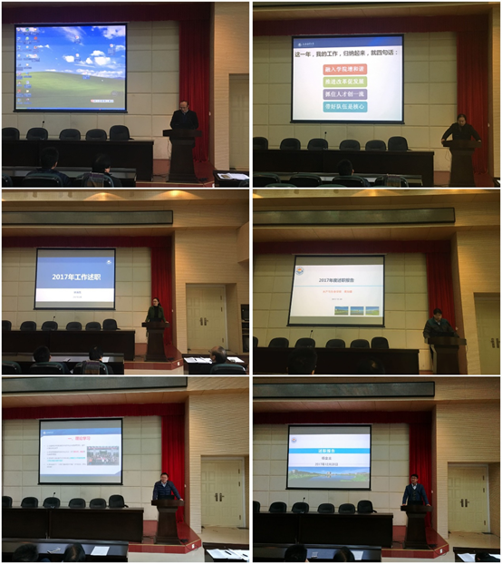 谭洪新经理首先从政治理论学习、履职能力、个人业绩、工作展望等四个方面向全体教职工进行了岗位述职报告;张宗恩书记用“融入公司增和谐,推进改革促发展,抓住人才创一流,带好队伍是核心”这四句话归纳了他这一年来的工作成绩;林海悦副书记从就业、资助、学风建设、党建、研究生、心理健康教育等6个方面系统的回顾了这1年来的工作开展情况;黄旭雄副经理分别从自己分管的本科教学工作、个人业务、遗憾与期待等方面对1年来的工作进行了系统的梳理;陈再忠副经理从政治理论学习、分管的研究生工作、个人业绩、不足之处及下一步打算等5各方面进行了了总结汇报,杨金龙副经理对自己分管的科研、科技工作、个人业绩、不足之处及展望等方面进行了述职总结。