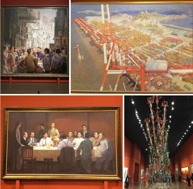 此次展览选取出生在上海或在上海工作的美术家的96件作品,象征中国共产党96年光辉历史。展览也反映出几十年来上海美术界坚持党的“双百方针”和“两为方向”所结出的丰硕成果。展览通过“门”这一极具象征性的符号,回顾中华民族波澜壮阔的历程并展望未来,在结构上分为四个板块,“石库门”“窑洞门”“天安门”“复兴门”,这些“门”都是中国共产党“进行伟大斗争、建设伟大工程、推进伟大事业、实现伟大梦想”的缩影和象征。反映习近平总书记关注上海民生的《牵挂》、96辆共享单车组成的大型互动装置《天路》、描绘上海大发展的《上海自贸区-东方大港》、再现中共一大召开时历史性一刻的《曙光》等展出作品鲜活生动,极具感染力,让老师们纷纷驻足欣赏,赞叹不已。