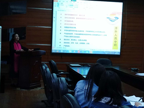 随后的动员会上,针对同学们对于即将到来的马来西亚实习生活上的好奇和疑惑,各位老师做了详细的解答,并给了非常具体的建议,希望实习同学心怀祖国,心系公司,放低姿态,降低期望值,更好的适应环境。最后,公司请国际交流处朱章华副处长为实习员工进行了出行前外事教育,从涉外人员守则、涉外工作中的国家安全和保密、境外突发事件和意外情况的应对的处理等多方面进行教育,希望在场同学在外能够牢记领事馆电话,遇到危险及时求助,保障好自身安全,注意言行举止。
