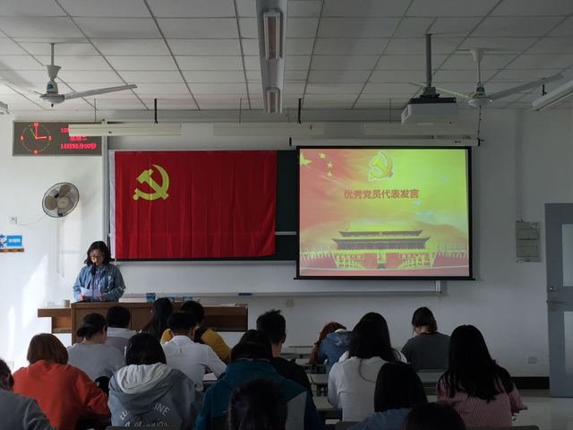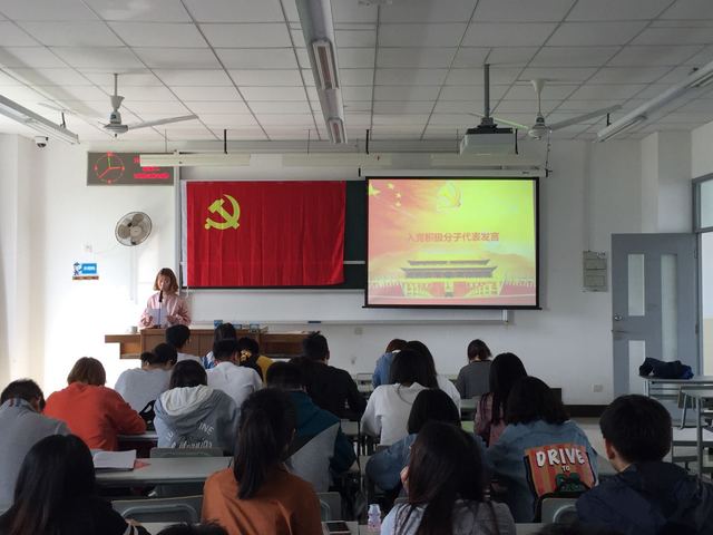 入党积极分子代表文登鑫同学代表全体积极分子发言。她表示:在今后的学习和生活中,她将会以身边这些党员作为学习榜样,努力学习他们吃苦在先,无私奉献的精神,学习他们自强不息,艰苦奋斗的精神。要用一名共产党员的标准严格要求和鞭策自己,更好地为身边的人服务,为所热爱的事业贡献自己的青春和力量,也为党的建设做出应有的贡献。争取早日站在鲜艳的党旗下宣誓,成为伟大的中国共产党大家庭中的一员。