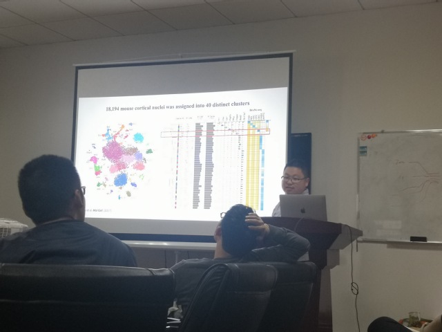 胡鹏博士首先介绍了单细胞测序技术的研究进展以及多种高通量测序技术优缺点,对于一些较难分离完整单细胞悬液的组织或者冷冻样品,单细胞核测序技术有着明显的优势,胡鹏博士通过研发高通量高通量细胞核测序技术(sNucDrop-seq),系统的解析了小鼠大脑中40多种不同的细胞类型,其研究成果发表于cell子刊molecular cell。进一步利用这项技术解析了小鼠心肌症模型中不同细胞类型特异的调控网络,其成果发表于国际知名期刊Genes & Development. 随后介绍了最新正在研究中的新生转录本单细胞标记技术,通过这项技术可以在单细胞水平研究mRNA的代谢动力学。最后,通过展示单细胞测序技术应用于小鼠垂体上研究的例子,为我们揭示了如何通过这项技术来解决实际的生物学问题。引发与会人员的广泛兴趣。yl6809永利相关科研人员和研究生认真听取了报告,并就感兴趣的问题与胡博士展开了热烈的交流和讨论。