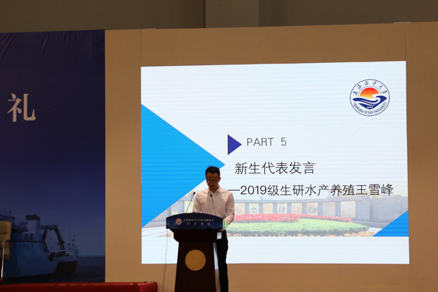 2017级生物学研究生李斯琪、2016级水产养殖学本科生连一霖作为老生代表分别表达了对新入学研究生、本科生的殷殷期待和欢迎,并用自己的亲身经历鼓励新生努力学习,为海大未来建设贡献自己的力量。2019级水产养殖专业研究生王雪峰同学作为新生代表发言,他表示愿以优秀师兄、师姐为榜样,投身水产行业建设,为再续海大辉煌努力奋斗。