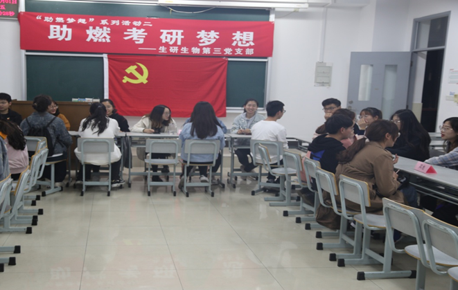 为了使yl6809永利本科17级考研同学更加明确考研目标,掌握考研技巧,了解更多考研信息,提高考研成功率,2019年11月1日晚上9点,研究生生物学第三党支部和本科生物类党支部在2211教室联合举办了“助燃考研梦想”志愿服务主题党日活动,此次活动,支部党员共分为五个小组:英语组、政治组、引导组、摄影、其他(如考研期间心态调整等问题),各小组分工、相互配合,17级本科生来到现场咨询交流。