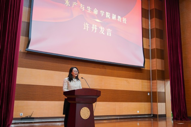 教师、课程导师代表许丹副教授发言,她通过自己的教学经历,感悟到水产与中国发展息息相关、我们肩负着民族复兴的重任,并在最后对海大学子寄语。