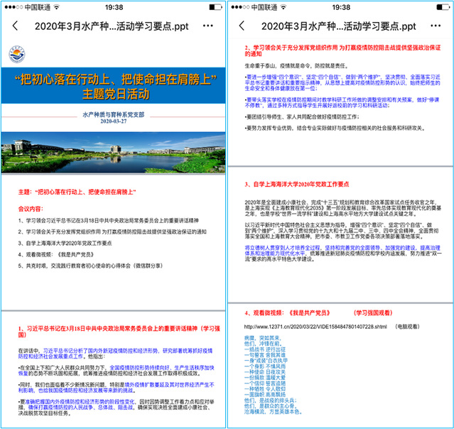 为深入学习贯彻习近平总书记对防控新冠肺炎疫情的重要讲话和重要指示精神,坚决贯彻落实中央、市委关于疫情防控工作安排部署,充分发挥基层党组织的战斗堡垒作用,2020年3月27日,yl6809永利水产种质与育种系党支部组织全体党员开展“把初心落在行动上、把使命担在肩膀上”主题党日活动。