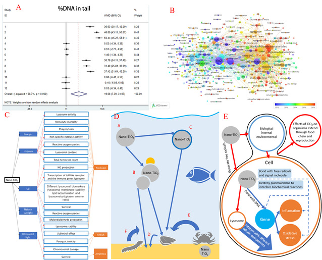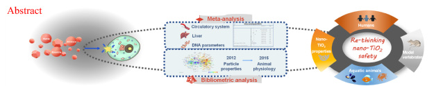 该工作以Meta分析和文献计量学分析为主要手段,对纳米TiO2的安全性和毒性效应进行了系统分析和评估,针对纳米TiO2在环境中的“安全浓度”的阈值进行了挖掘并探究了纳米TiO2的颗粒性质对于其毒理学效应产生的影响,提出了基因毒性、膜损伤、炎症和氧化应激是纳米TiO2产生毒理学效应的主要机制,纳米TiO2对水生动物的毒性表现为对其摄食、繁殖和免疫等与健康相关的生物体性状产生负面影响。本研究全面系统地阐明了纳米TiO2的毒理学效应,有助于全面地认识纳米TiO2的健康和生态安全性,并为纳米TiO2在纳米科技发展和应用方面提供了新见解。
