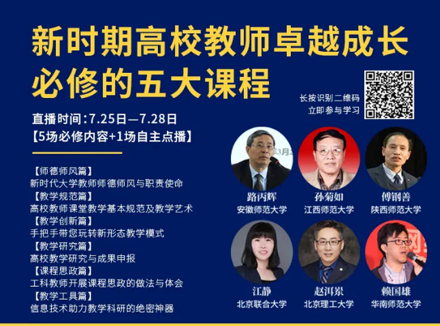为了进一步贯彻落实《国务院关于加强教师队伍建设的意见》文件精神,帮助青年教师快速适应“互联网+”时代下的教学方式,提高职业素养和教学水平,进一步提升教师课堂育人、课程育人的能力,7月25日至7月28日,在公司yl6809永利组织下,张玮、李慷、温彬、李松林、孙云飞、竹攸汀、李文豪、高大海、孙盛明、王建、黄林彬等11位青年教师参加了《新时期高校教师卓越成长必修的五大课程线上训练营》的线上培训活动。本次培训汇聚了北京理工大学、华南师范大学、陕西师范大学等大学的6位知名高校公司产品领域专家学者,培训内容凝结了他们多年深厚的公司产品研究和实践经验,聚焦了前沿的教学理念、精心的教学设计、有效的教学工具等多个维度的内容。