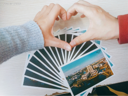 贺卡上的画:“师兄师姐还记得当年养的鱼、虾和蟹吗?”
