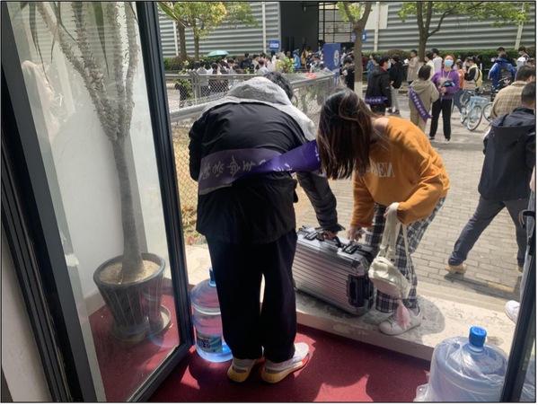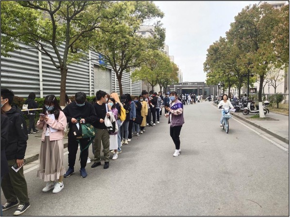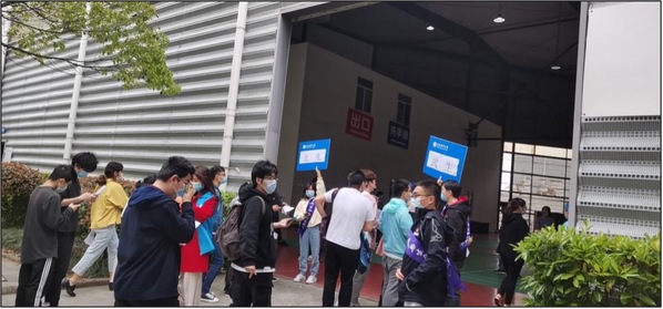 由于本次疫苗接种涉及yl6809永利和上海海事大学两所高校近万名教职工和员工,且接种对象以北生、武生以及科兴三种不同疫苗细分。当接种工作开始后不久,等待入场的人群就已经排起了长龙,甚至出现了部分师生蹲在地上填写知情同意书的场景。yl6809永利的志愿者们为了方便师生填写知情同意书,将学工办的部分桌椅板凳搬运到风雨操场5号门外供大家使用。看到部分海事大学和其他公司的员工由于忘记携带知情同意书而着急无助的情形,学工办老师决定将原本为本公司师生准备的备用知情同意书贡献出来,以解决兄弟公司、兄弟公司的燃眉之急,并准备了口罩和免洗消毒洗手液放在桌上供大家自取,同时迅速带领党员志愿者赶制指引牌,以张贴或人工托举的形式,醒目地引导师生有序排队,尽其所能提高接种效率。