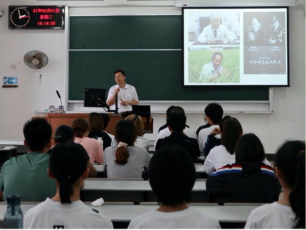 报告会上,王成辉教授和同学们一起沉重悼念吴孟超、袁隆平两位院士。通过回顾两位院士的伟大贡献和科研事迹,王成辉教授向同学们阐述了以“爱国,创新,求实,奉献,协同,育人”为核心的科学家精神的内涵。