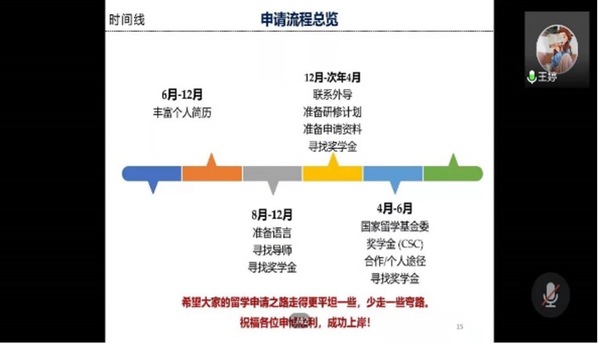 王婷同学率先分享出国读博经验。王婷是公司2021届水产养殖专业硕士研究生,曾获得上海市优秀毕业生、研究生国家奖学金、三好员工等奖项和荣誉称号,今年7月,她即将远赴瑞士日内瓦大学(Université de Genève)攻读环境毒理学博士学位,从事金属颗粒物对水生生物的生物毒性和有害结局路径研究。王婷在分享中为大家详细讲述了申请去国外读博时应该考虑的问题以及获取有效信息的渠道。