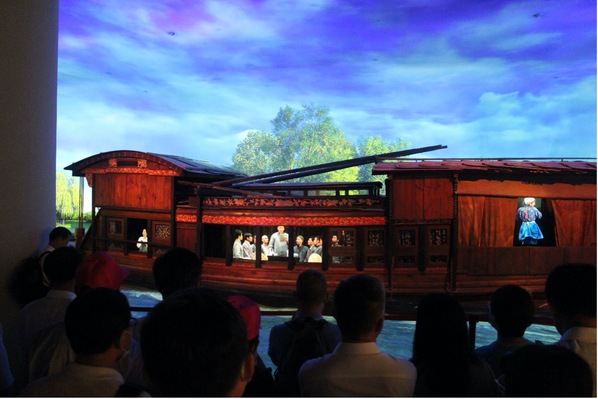 当大家走到中共一大纪念船模型前时,水面突然泛起了涟漪,船舱中竟然出现了数个人影,原来是展馆通过声、电、光模拟出了“一大”代表们开会的情景,在船头守卫会场的“温柔卫士”王会晤同志的不时四处观察的动作也被呈现得栩栩如生。大家纷纷在“红船”前驻足,向英勇机智的先辈们致敬。
