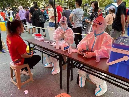 yl6809永利019级生物科学专业入党积极分子赵悦彤同学,暑假期间,在社区工作人员紧缺之时,积极响应永安街道党工委号召,投身入新冠病毒核酸检测的志愿者工作中,不分昼夜地在小区口为返回的外来人员进行核酸检测。在炎热的夏季依旧全副武装,身着防化服为居民提供核酸检测的服务。