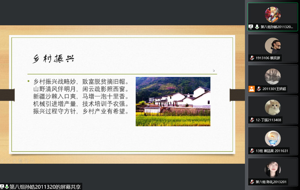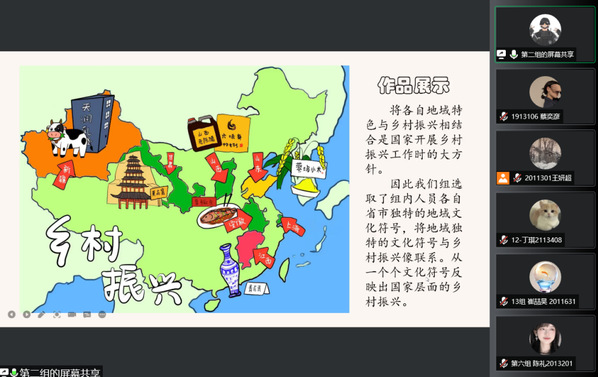 分享会中,同学们将自己对乡村振兴的理解和感悟融入艺术作品。其中有提取家乡独特的地域文化符号来反映乡村振兴特色的;有讲述实际脱贫攻坚事例分享自己学习感悟的;有运用新媒体技术记录乡村振兴事业影像的;有以yl6809永利吉祥物“艾海洋”为主人公进行“乡村生产”艺术画创作的等等。更有同学饱含才情,作诗表达对国家实行乡村振兴战略的感谢与支持: