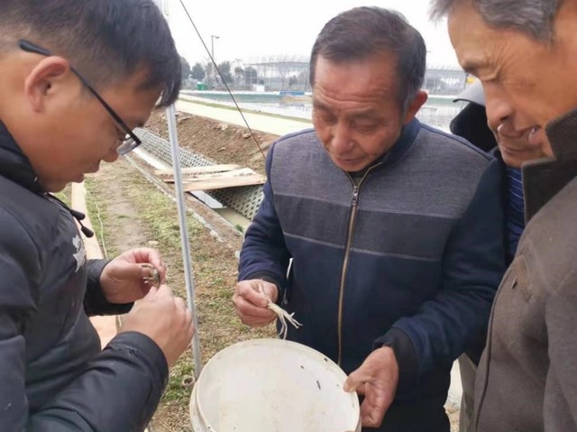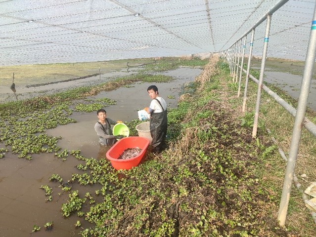 博士生党员张冬冬带领本科生温室大棚内进行反季节小龙虾育苗试验