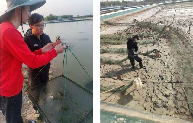 研究生杨帅帅和周旋查看小龙虾摄食情况 本科生黄明龙修补地笼进行扣蟹捕捞