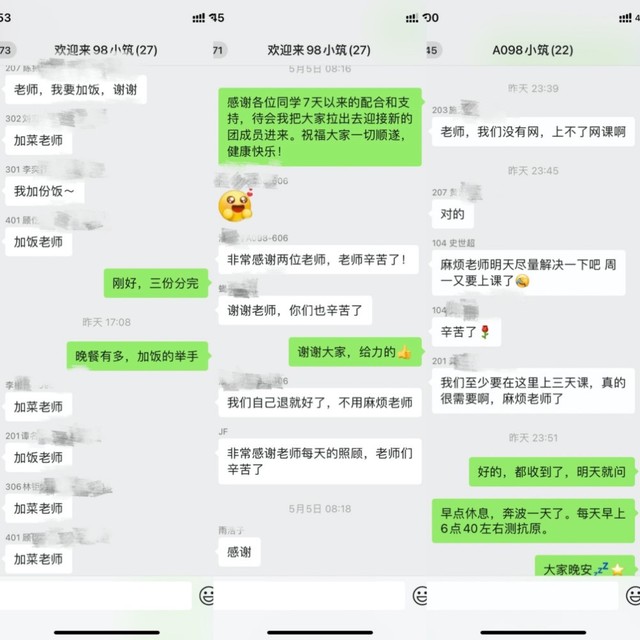 在第十一员工社区区委书记和区长的指导下,柯蓝不仅在工作中从严规范隔离、消杀和转运流程,而且细致入微将对员工们的关爱落到每一个细节,安定同学们的紧张情绪,给隔离楼的每一位同学带来回家般的温暖。她在微信群里对同学们的问题做到有问必答,有难必解,及时了解员工需求,尽力给予保障。看着同学们从刚入住时的透露着紧张不安的各种小问题,到快结束隔离时发自内心对老师们表达的感谢之词,她感到无比欣慰。她认为自己的坚守换来同学们的理解、支持和安全,一切辛苦都值得。正是每位党员都永葆发光螺丝钉的坚韧,充满干劲的牢牢拧在人民最需要的地方,才能为疫情防控攻坚战的胜利打下坚实基础。