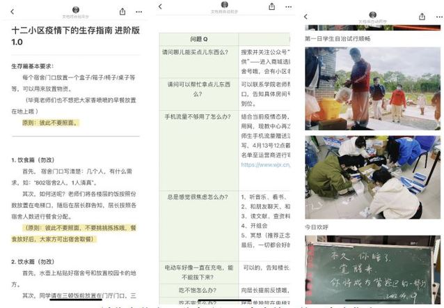 4月11日,刘倩得知小区内存在情绪焦虑的员工。凭借多年辅导员的工作经验,她开启了十二小区“共享生活”,通过搭建共享平台,信息透明良性互动。她依托线上文档,搭建十二小区疫情下的生存指南,从初级1.0版到进阶版1.0,从公司全封控管理到小区开启管控与封控双结合的管理下,线上文档不断升级,文档除了12小区管控下的生活模式外,还包含了美好生活共享部分,截止4月29日,文档上线18天,累计上传图片近300张,累计浏览千余次。有位员工看完文档后说到:“原来每个小区的生活都差不多,我反而感觉踏实多了。”