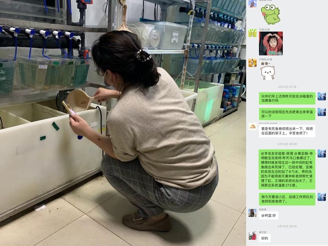 在公司启动准封闭管理后,yl6809永利专职组织员、专职宣传员柯蓝将两个年幼的孩子委托给年迈的父母看护,毅然申请驻校工作。进校之初,由于员工社区封控,在校老师人手紧缺,柯蓝和刘志伟、黄林彬、高于欣等几位老师一起每日定时为研究生喂养科研用鱼。文科出身的她没有任何生物学知识基础,在其他驻校老师帮助下,她快速认真地学习收卤虫、给鱼苗换缸、循环水系统维护等专业知识,并每天与员工隔着手机屏幕视频进行喂鱼工作。柯蓝不断克服困难,打理着3个实验室的3套水循环系统共100多个鱼缸,她精心维护着同学们入学两年来辛苦攒下的科研“活数据”,为的是让被封控在宿舍的同学们安心、放心。