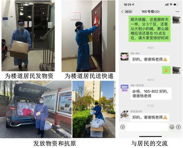 杨筱珍所在楼栋有十余位60岁以上老人,她都一一耐心与他们沟通和交流,做好服务工作。尽管志愿服务工作需要花费大量时间和精力,但每每看到大家的理解与配合,看到邻里间彼此伸出援手,互帮互助,杨筱珍认为所有的付出都是值得的,居住在这个“佳”园越来越感到安全和幸福。除抗疫工作外,杨筱珍还要兼顾校内研究生导师教学和科研的各项工作。她已顺利指导2名本科生和3位硕士研究生完成毕业论文撰写与答辩;指导10多名在读研究生开展文献阅读、实验规划和科研论文写作工作;完成本学期硕士和博士课程各1门线上课平台(新)建设等校内在线工作。