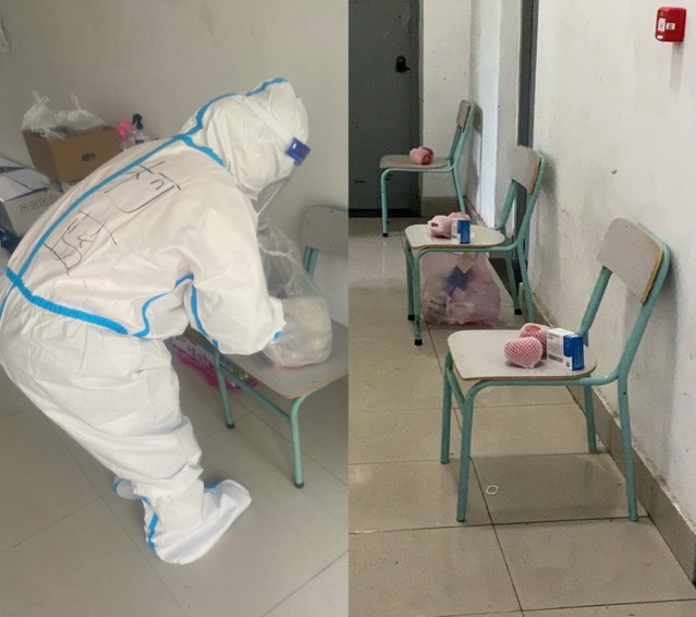 隔离楼栋每隔7天就要进行一次员工入住和转运工作。每当有员工要入住楼栋,柯蓝都提前做好名牌,对应贴在每个宿舍门上,便于更好地开展送餐、送物资、测抗原和上门核酸等工作;提前建立好员工微信群,了解员工诉求,并在区内其他老师帮助下,将同学们的生活必需品放进宿舍。按照公司疫情防控要求,入驻隔离楼栋的员工足不出户,无接触配餐,每日餐食和其他物资由老师送上门。柯蓝身着防护服,每日爬六楼十几趟为同学们送三餐、饮用水和其他物资,一送就是二十天。有时她抱着物资一边上楼,汗水顺着额头滑到眼角一滴滴落下,眼镜和防护面罩被湿气晕染得模糊不清,只能用随身携带的酒精喷壶喷洒面部,驱散雾气继续工作;有时因多次往返高楼层,心跳加快呼吸困难,而她仅站在楼梯上停留几秒大口喘息几次,便继续工作,为的是尽快将热乎乎的饭菜送到同学们宿舍门口。每晚她严格按照要求回收隔离楼栋所有垃圾装入医疗垃圾袋,消杀后用捆扎绳封死运送到指定回收地点。每次工作完毕脱下防护服,她已经汗得浑身透湿。二十天以来,她努力保障了三批次共计78名员工顺利结束隔离,返回原宿舍。