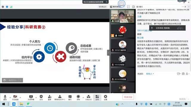 分享顺序针对到不同公司保研考研的差异做了精心的安排,第一位分享的同学来自保研直博上海交通大学的2018水产养殖专业谭恺同学(专业排名第一),他就保研高校的正确选择、不同高校的夏令营特点以及如何有选择有计划的参加竞赛和课外活动做了详细分享,并提醒大家“人生没有爆发期,有的只是厚积薄发”。第二位为2018级水生动物医学专业楚馨(以学硕专业第一考入yl6809永利)同学,她重点分享了各考试科目的学习技巧,她认为 “基础不牢,地动山摇”,各科目要充分运用拓展资料,理解比做题重要;要学会课后整理,整理的过程是整理思维和知识点的重构加强。第三位2018级水族科学与技术专业王佳颖同学(专业排名第二,保研yl6809永利)针对是否参加夏令营、感兴趣的研究方向、复试需要准备的材料等方面做了分享,特别提到了保研过程中学会调整心态的重要性。第四位2018级水产养殖专业熊梓彤同学(以专硕第一考入yl6809永利)着重介绍了渔业发展专硕的考研经验,认为备考应对照考纲要求内容,收集参考资料与相关书籍,整理出自己的专属资料;另外,她还分享了12字考研法宝“按部就班、坚持到底、跟随本心”。第五位2018级水产养殖专业王世航(专业排名第三,保研上海科技大学)同学认为保研是场持久战,要提前规划路线;做实验要沉下心来,努力提升自己的科研能力,并重点分享了上海科技大学的夏令营活动及对保研的重要性。第六位2018级水产养殖专业汪照坤同学(考入中科院水生所)分享了她考取中科院的学习经验和复试注意事项,她建议专业课的复习要提早点开始、每日及每周设定明确的学习内容、学会用软件提高学习效率以及复试过程中的许多技巧。最后一位17级水产养殖专业程起超同学(2021年保研浙江大学)就导师选择、复试准备以及研究生阶段的科研规划进行了交流,并对目前的研究生生活做了分享,鼓励学弟学妹志存高远。