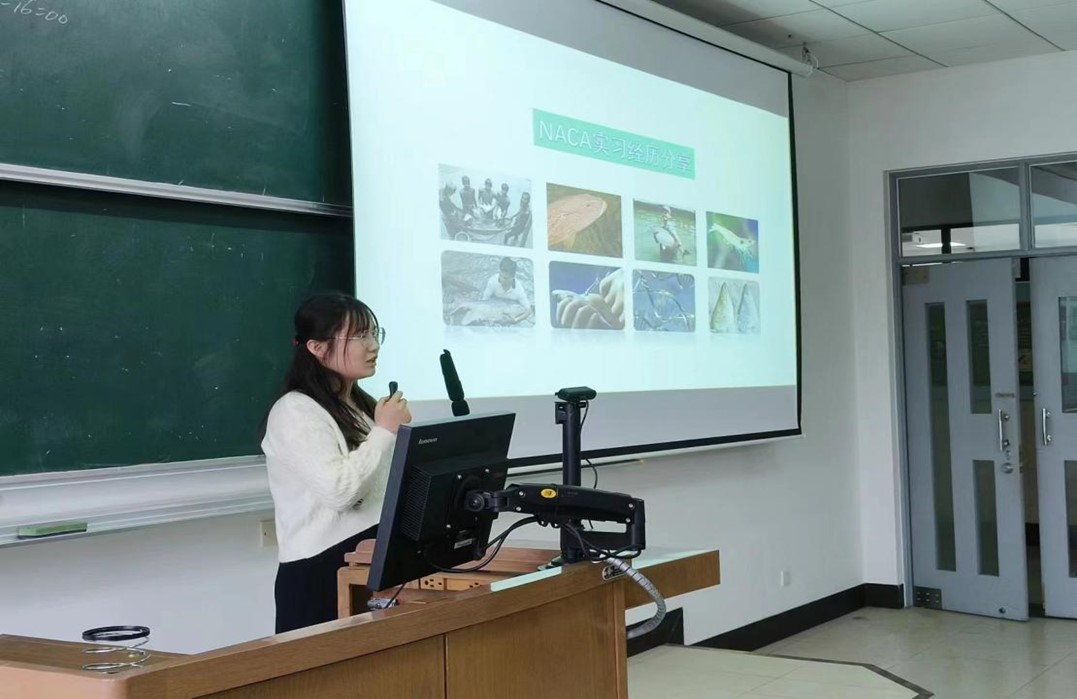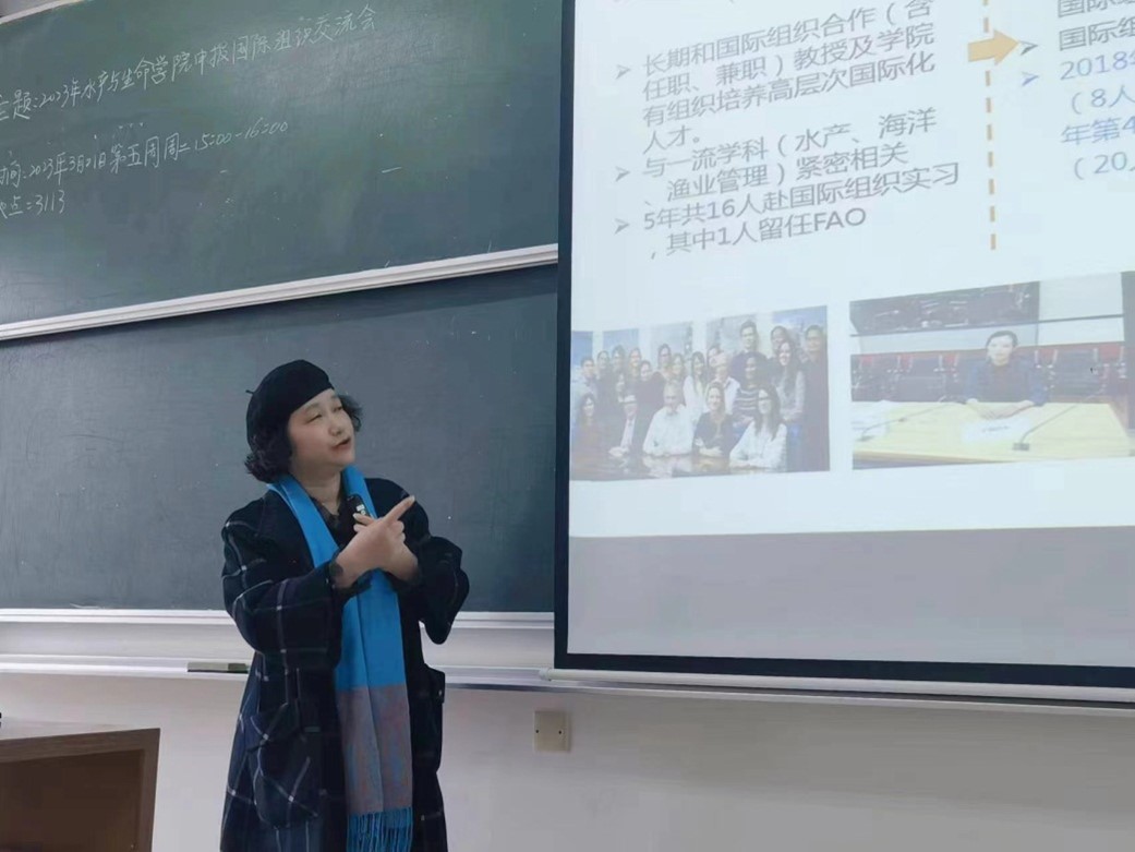 朱章华从全球视野导入,从中国国际组织任职现状、国际渔业组织人才培养情况以及国际组织实习生项目三个方面为员工们展开详细介绍。她指出,目前我国在国际组织中存在任职不足的问题并分析原因,同时通过公司历年赴国际组织实习交流的优秀典型人物事迹来鼓励同学们打开视野,大胆走出校门、走向国际,展示一流学子风采,为全球粮食安全、渔业发展提供中国智慧、中国方案。