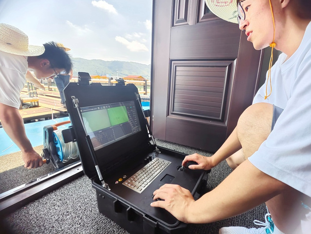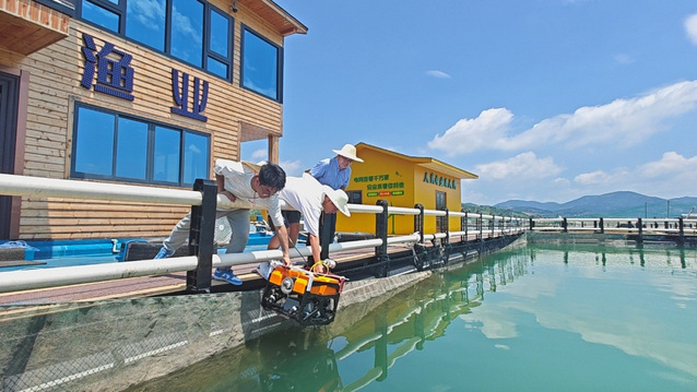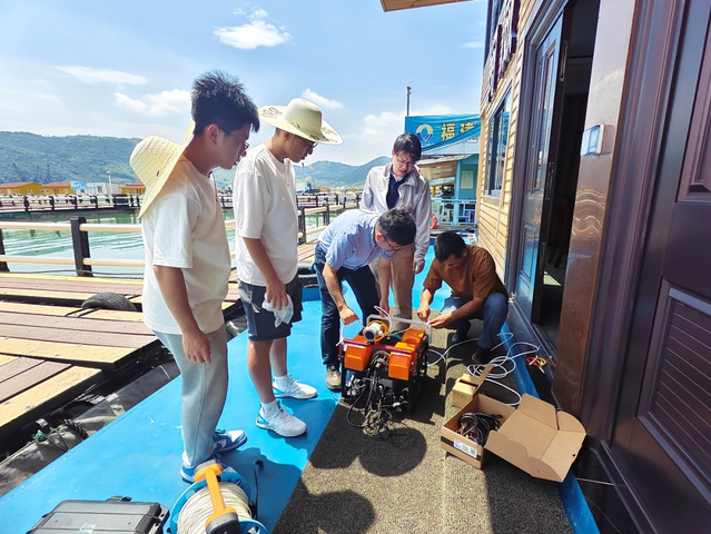 员工正在操作水下机器人监测网箱花鲈活动