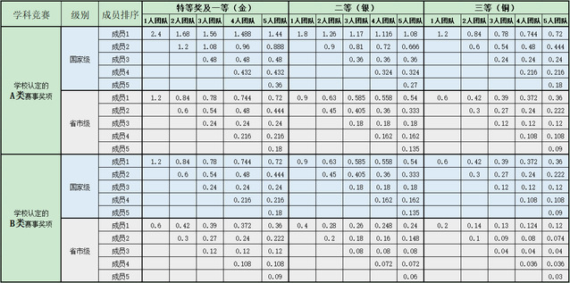 ④以团队获得奖励荣誉的,按照贡献度依次计算绩点,各成员绩点分配比例见附表3。