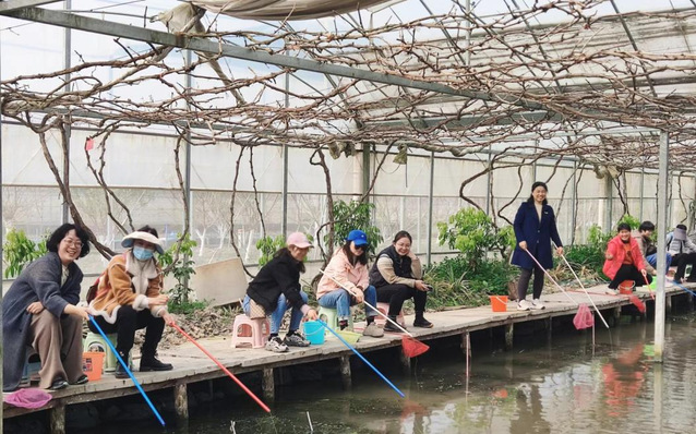女教工参观了上海开太枫泾净水渔业示范基地。品类繁多的农作物种类和种养结合的农业新模式深深震撼了大家。辅导员王洁老师说:以往参观水产养殖专业相关的基地看到的是鱼虾满塘、饲料味很足的充满水产腥味的场所。但今天鱼文化基地完全颠覆了我对水产基地的认识,周围弥漫着淡淡的蔬果香味和植物的芬芳,第一次看到生龙活虎的鱼虾与五颜六色的果蔬这么协调地共生在一起,真的是鱼文化的创新,让我们看到了水产养殖的未来,看到了农学类员工光明且无量的前途。参观过程中,女教工还进行小龙虾垂钓、放苗等鱼文化体验活动,了解基地的鱼文化内涵,大家纷纷表示要把基地和这里的鱼文化传播给周围的人,让更多的人来了解和体验。