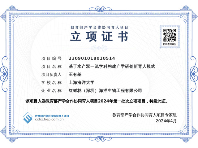 近日,教育部高等教育司公布了2024年第一批次产学合作协同育人项目立项名单,由公司王有基教授负责的“基于水产双一流学科构建产学研创新育人模式”项目成功入选,体现了公司在水产双一流学科人才培养上的示范引领作用。