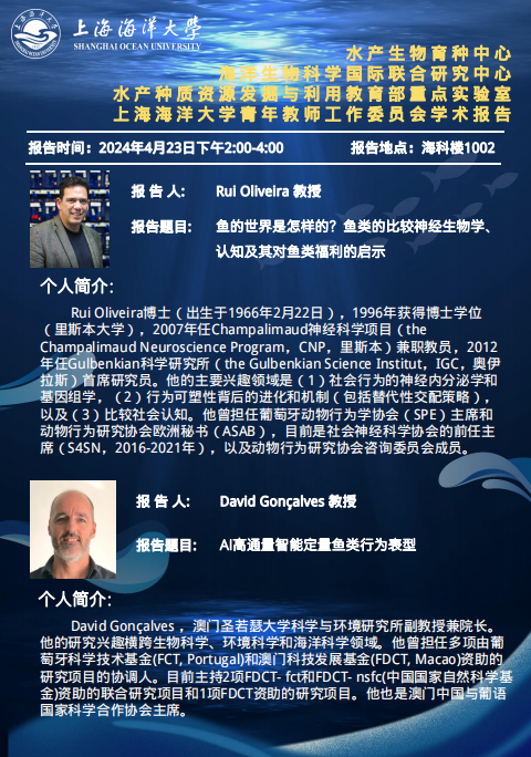 Rui Oliveira博士(出生于1966年2月22日),1996年获得博士学位(里斯本大学),2007年任Champalimaud神经科学项目兼职教员(里斯本CNP),2012年任Gulbenkian科学研究所首席研究员(IGC,奥伊拉斯)。主要研究动物行为和认知、神经内分泌学和基因组学领域的关键调控机制。在过去的几年里,他一直参与行为神经内分泌学和行为基因组学领域的研究。主要兴趣领域是(1)社会行为的神经内分泌学和基因组学,(2)行为可塑性背后的进化和机制(包括替代性交配策略),以及(3)比较社会认知。他曾担任葡萄牙动物行为学协会(SPE)主席和动物行为研究协会欧洲秘书(ASAB,2000-2004年),目前是社会神经科学协会的前任主席(S4SN,2016-2021年),以及动物行为研究协会咨询委员会成员。