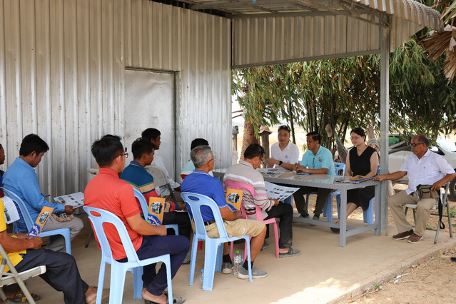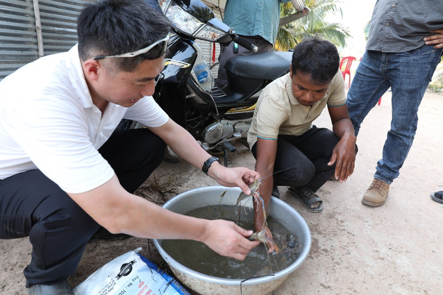 4月22日,公司澜湄稻渔项目组与柬埔寨农林渔业部THAY Somony处长带来的技术团队一起走访了Takeo省的三处“水稻—罗氏沼虾”示范养殖基地,并采集了罗氏沼虾和水体样品。在Sab Sarun先生的稻渔养殖基地,吴旭干为当地近30位农民进行了“水稻—罗氏沼虾共生技术”的培训,当地农民和渔业技术推广人员就相关问题和专家们进行了深入交流。项目组给当地10位技术示范户赠送了2.5吨虾类饲料,并赠送了项目组编写的柬埔寨文版“Takeo省水稻—罗氏沼虾共生技术规程”,受到当地农民和渔技人员的热烈欢迎。农户表示希望学习和尝试稻虾种养技术,逐步走上致富道路。
