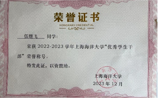 在过去的两年时间里,伍煜飞积极参加社会实践活动。在2023年的暑期,他参加了由公司和校团委共同指导的《“水上”科技小院:“支”农爱农,水产养殖劳动实践及技术推广社会实践》,他主要负责前往上海金山虾类科技小院,进行一线的实地调研和采访交流,探索出科技小院现存的问题和不足,通过大量的资料查询和实地调研的结果,提出相应的对策建议。同时,他们实践的过程还被制作成生动形象的课程,在网络上进行发表,通过科普的形式扩大了“水上”科技小院的影响力,搭建了科技小院志愿服务平台和思政大课堂。