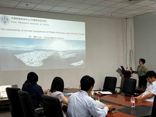 2024年5月29日,中国极地研究中心研究员、上海交通大学双聘教授罗玮博士作了题为“The Vulnerability of Ice-Free Ecosystems of Fildes Peninsula under climate change”的学术报告。报告由陈良标教授主持。