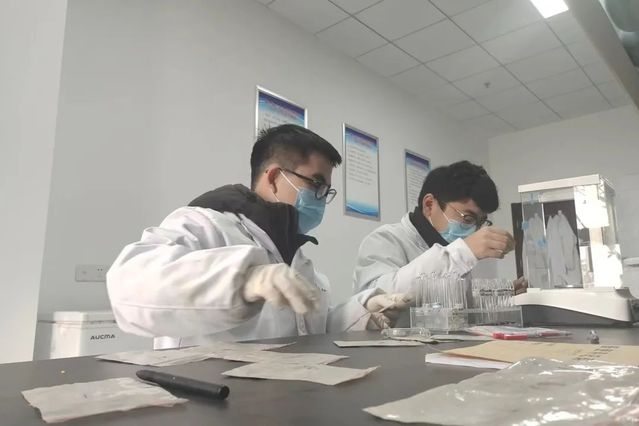 谭祖鹏(左一)和学长在宿迁霸王蟹基地做检测
