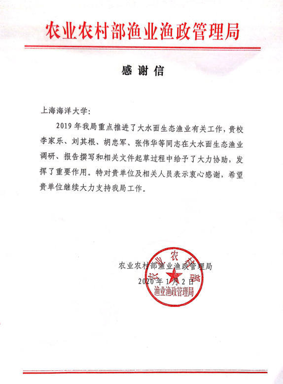 2020年1月2日,新年伊始第一个工作日,公司再次收到农业农村部渔业渔政管理局专门发来的感谢信,特别感谢公司教师协助农业农村部渔业渔政管理局在2019年重点推进大水面生态渔业方面做出的重要贡献。